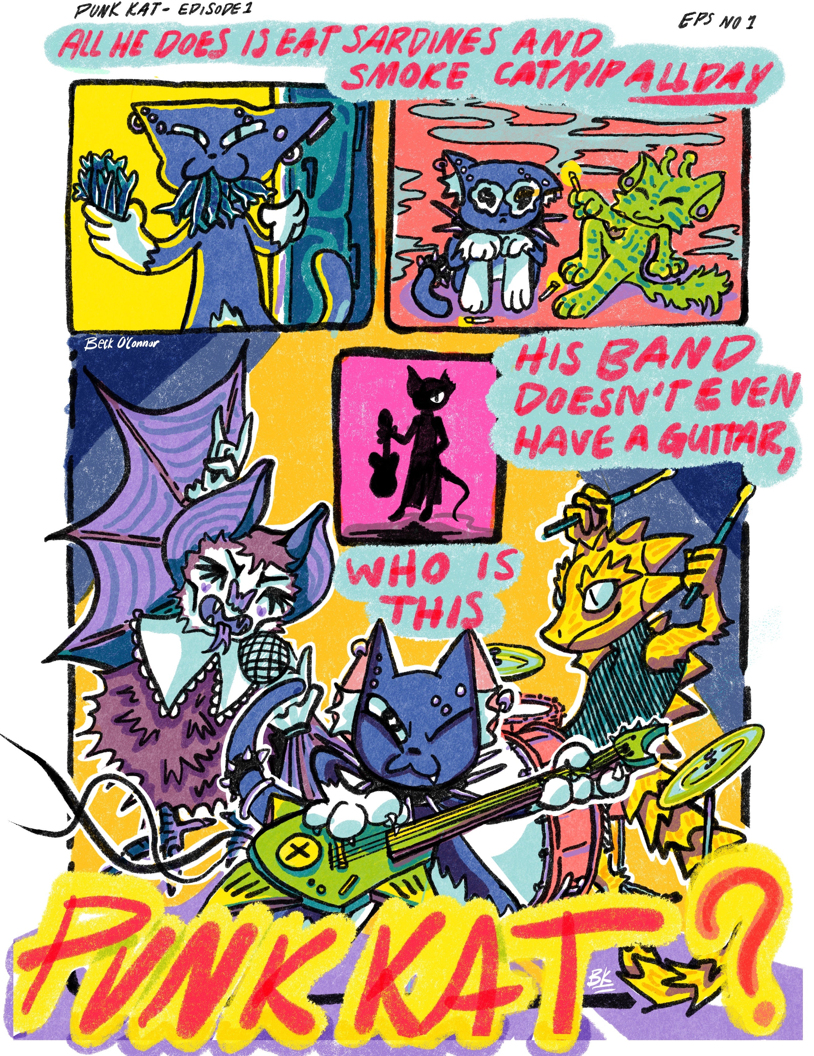 Soon to be coming out in the Zine Vol. No. 1 PUNK KAT and Friends explores the wild life of PUNK KAT, a wild little guy who believe in living life to the fullest and playing gigs with his friends and bandmates Goth Bat and Cyber Lizard in their band Critters Club.